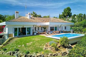 (The air conditioning does not include the rental price. You will then also be charged for the meter reading and costs for air conditioning) At this beautifully decorated villa you will not miss out on anything during your vacation. Really everywhere is thought of. With its cozy furnished covered terraces and large swimming pool with beautifully landscaped garden you can completely relax with family or friends. The crowds can be found within a stone's throw of the better restaurants, beaches, golf clubs. Both young and old have a great time here with chill lounge terrace at the pool while the children enjoy the pool, slide or football in the large garden. Inside the house breathes a holiday atmosphere in typical Bohemian-Moorish style and gives you the comfort you need with its 3 luxuriously finished bathrooms, spacious fully equipped kitchen and many seating areas in the house. Of the 5 bedrooms there is a specially designed for children with toys and games so that they will not lack anything....